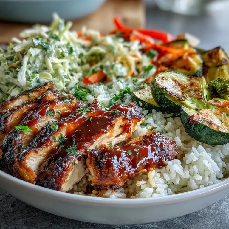 The architecture of this bowl is intentional; each component has its own flavor and texture so the final bite has contrast. Rice absorbs the juices from the chicken and vegetables, coleslaw stays crisp because it's separated until the last moment, and roasted vegetables add char and sweetness that balance the savory BBQ glaze. Nothing competes for space, and everything contributes to the whole in a way that feels generous rather than crowded.