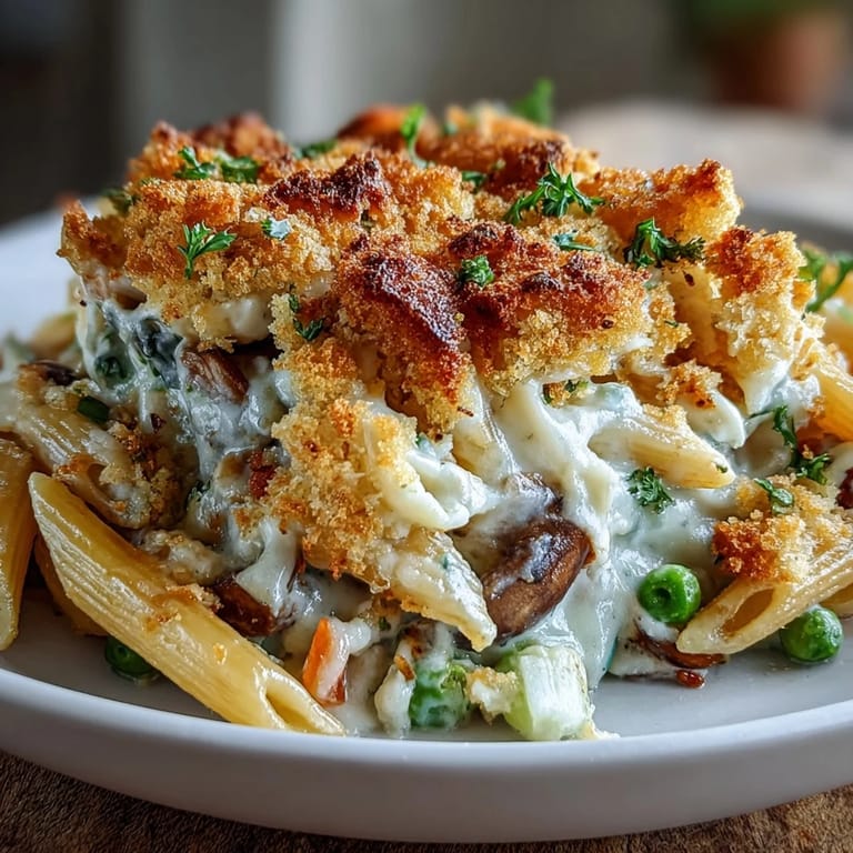 Save to Pinterest My neighbor Sarah brought over this dish on a Tuesday evening when my kitchen felt too quiet, and I've been chasing that same cozy feeling ever since. It's the kind of meal that tastes like someone wrapped you in warmth—creamy pasta studded with vegetables, all crowned with a golden, buttery crumb topping that shatters when your spoon hits it. The first time I made it, I was skeptical about combining two comfort foods, but that skepticism lasted about thirty seconds into the first bite. Now it's become my go-to when I want to feed people without spending hours at the stove. There's something almost healing about how straightforward it is.