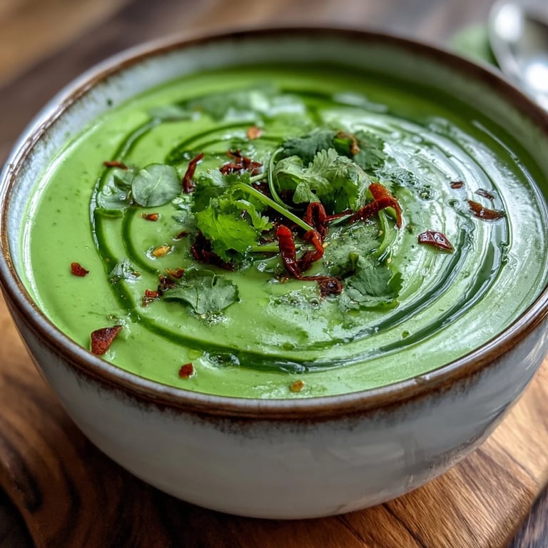 - Ladle into bowls and top with fresh coriander leaves and thin slices of red chili if you enjoy a hint of heat. The contrast of the vibrant garnishes against the green soup makes for a stunning presentation.